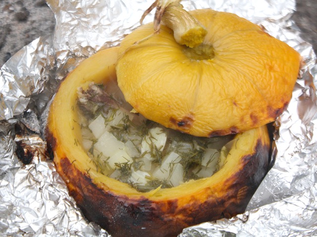 одела крышку на тыкву - тыквенную же, замотала в фольку, поставила все на противень и запихнула в духовку.