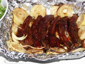 Да, так вот, теперь мажем ребра любым соусом барбекю (о, как!), рекомендую какой-нибудь с повышенным содержанием сахара - он закарамелизуется и будет охуенно вкусно. И еще на пол часа в духовку на максимальной температуре. Можно обложить это дело лучком и сбрызнуть его соевым соусом. Получаем что-то вроде - см. картинку.