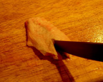 Обнажив кости, выворачиваем кусок крылошка наизнанку, как матку, и удаляем тонкую кость.