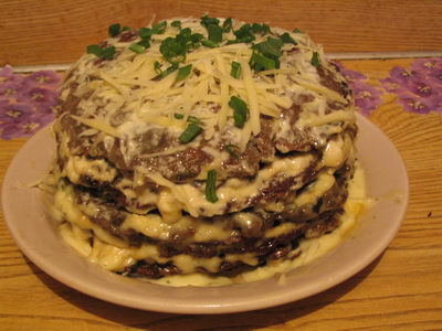 а еще заебись с лучком грибов пожарить и захуярить между слоев.