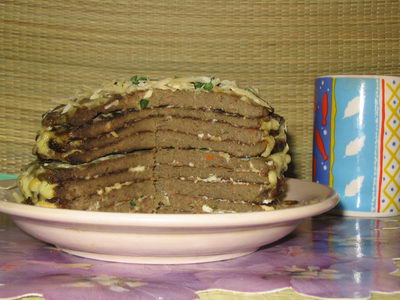 В кулинарии мне почему-то всегда хочется проявить себя, только когда я чего-нибуть нехорошее натворила…а так как последнее время из меня негатиф так и прёт, решила я выплеснуть из себя немного позитива и сделать своему дарагому другу приятный сюрприс… Правда особого сюрприза не получилось, так как был выходной и благоверный находился на территории прилегающей к кухне, в пределах которой я и вознамерилась осуществить задуманное. А именно приготовить пальчикооблизательный печоночный тортик, коим рецептом спешу с вами поделиться, дарагие маи подонки!