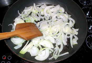 В это время разагреваем скаваротку, наливаем немножко растительного или топленого масла (любители свиного вкуса могут вытопить сало) и слехка поджариваем нарезанный кольцами лук.