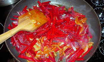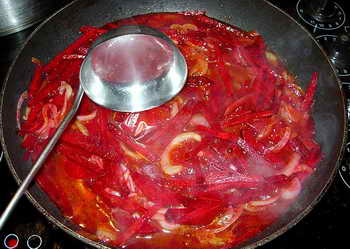 Перемешав это дело и дождавшись, когда свекла абмякнет, достаем ис кастрюли, где варица мясо, два-три черпака бульона (ниибет, что он не достиг определенной крепости) и вливаем в скаваротку.