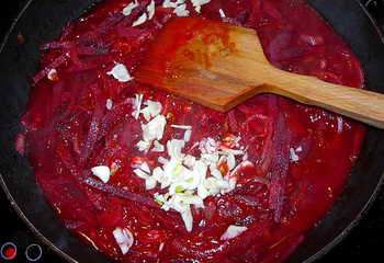 Учитывая, что при варке свекла может потерять цвет, вливаем в скаваротку две сталовые лошки лехкого уксуса. Убавляем агонь, скаваротку накрываем крышкой и даем свекле патушиться 20 минут. Только после этого слехка перчим свеклу черным перчиком и добавляем в скаваротку два мелко изрубленных зубчика чиснока.