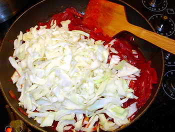 Как только лучок достаточно обмякнет, добавляем две сталовые лошки таматной пасты, харашенько перемешиваем и тут же дабавляем нарезанную мелкой саломкой свеклу.