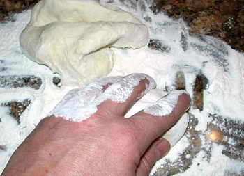 В течение трех минут размараживаем иго в микроволнофке и, обдав мукой, харашенько разминаем.