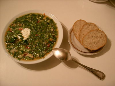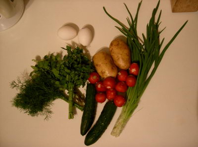 - зелень. Питрушка, укробчик, кинзушка па пучку. Но риальна фсё не уйдет. Резануть надо от каждава пучка на сваё усматрение, па фкусу.