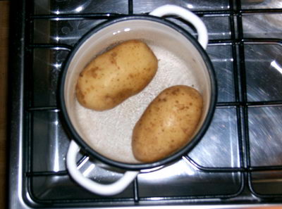 Иички, тожи перед варкой мона помыть, еси пелотка питуха снисла их, не сделаф предварительна очищчающчую клизьму. Их мы тожи варим в кажуре. Варим вкрутую. То есть, еси опустить их в кипяток, то через 10 минут посе закипания, мона вынимать. И под халодную воду, шоб они лехшэ чисьтились. Ну вот, фсё у нас сварилось. Картоху и иички чисьтим и кладём ф сторонку. Шоб остыло.