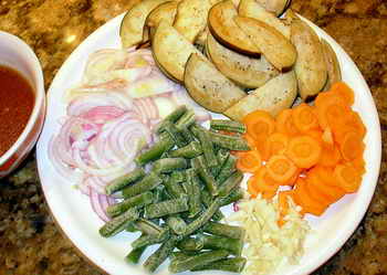 Сам же тем временем занялся заготофкой овощей «первого эшелона». Названное каличество лука порезал кольцами. Не счищая с баклажана шкурки, распустил его вдоль пополам и нарезал полукольцами поперек. Морковь резанул кружочками. Зубцы чиснока измельчил. Ну, а мароженую фасоль просто вылажил, чтоп отогревалась.