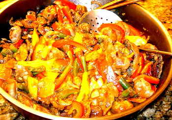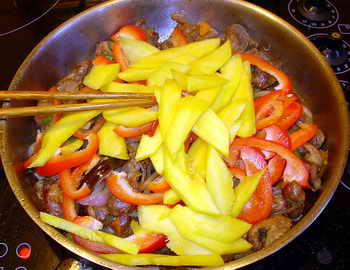 Много позже, когда мне довелось вживую пазнакомился с кетайской кухней, оказалось, что тогда, с желудками, по части идеологии и технологии их пригатавления я не шибко погрешил против истины. Готовят ли китайцы желудки именно так – не знаю: их кухня насчитывает более двух миллионов рицептоф, за всеми не угонишься. Но попробовать это блюдо именно в таком сочетании овощей, манго, специй и соусоф, придающих ему богатый контрастный вкус, рекомендую.