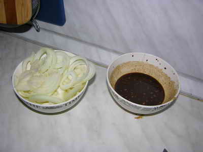 Потом мы все это дело размешиваем до получения однородной массы. Режем 2 средних луковицы кольцами и складываем их отдельно.
