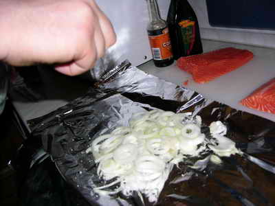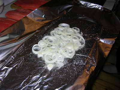 Стелим два куска фольги и выкладываем на них половину лука.