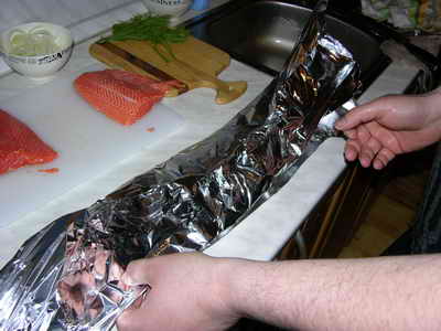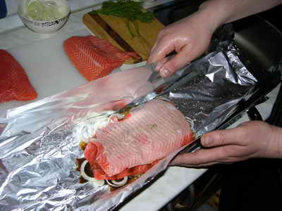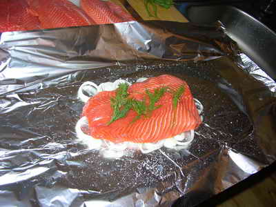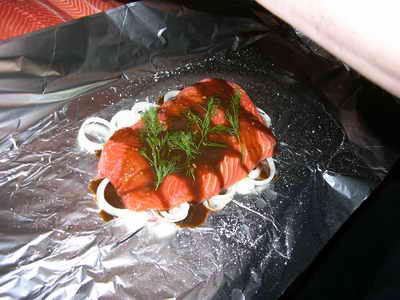 Кладем свехну немного укропа, поливаем нашим соусом, сверху кладем второй кусок форели и солим.