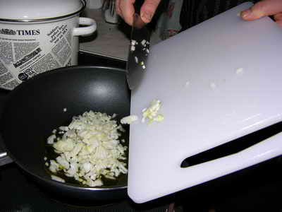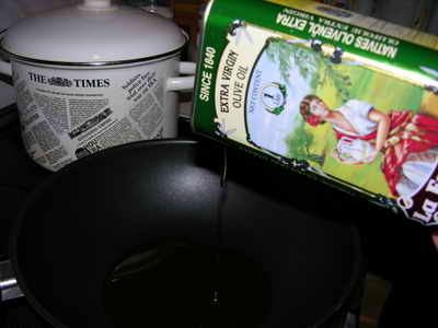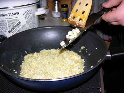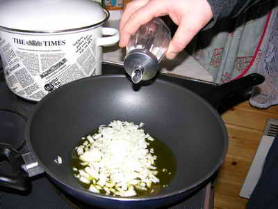 На разогретую сковородку наливаем оливкового масла и высыпаем в него мелко нарезанный лук.