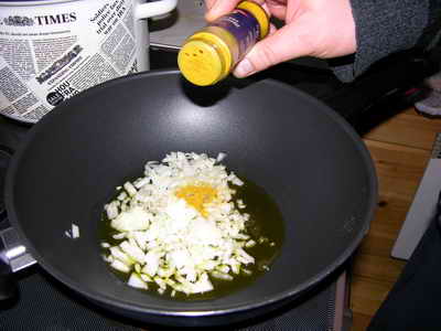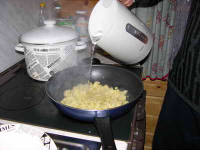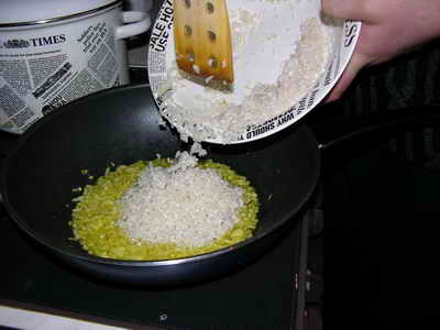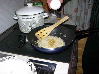 Солим, и когда немного обжарится лук - выкладываем предварительно замоченный рис.