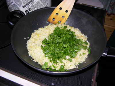 Закрываем крышкой и доводим до готовности. В готовый рис кладем мелко нарезанную петрушку и перемешиваем. Подаем с рыпкой.