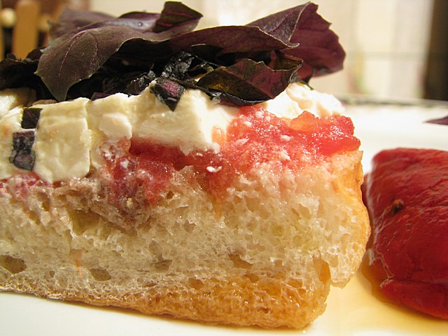 Помидор был обесшкурен и перемолот в блендере, хлеб разрезан надвое и сбрызнут бальзамическим уксусом.