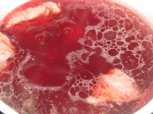 Свеклу хуячим в бульён, пусть вариццо. С осадка бульон сливать не стал, если пездато пену снять, свенина много гадости не даёт (рецепт вообше летний, тут зимняя еботня не к чему, быстро всё делается).