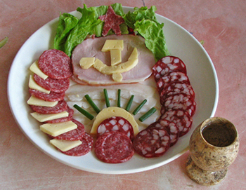 В общем, первый этап. Берем колбаску, сыр, листья салата, отголоски зеленого лука, сало, копченое мясо. Ну и, естественно, рюмашку.