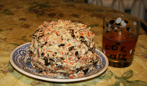 Сверху кладём следующий пласт и так же смазываем. И так - пока пласты не кончатся. По идее должно получиться образование, около напоминающее торт. У меня получился калабок.