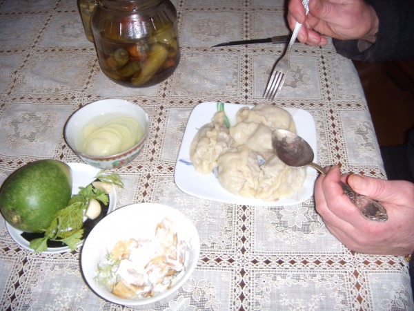 бедные пираги вареные,он на них и с вилкой и с лошкой нацелился.