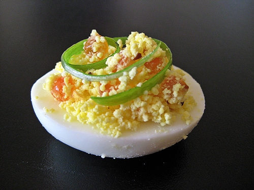>желток, протертый через сито, с икрой, красным перцем и лимонным соком: