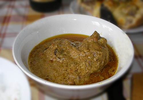 Очень вкусное блюдо – прекрасно сочетается с рисом и с манго (в тарелочках – это своего рода варенье из манго, только острое)… Я ела еще и с лепешкой – макая в соус… Вкус настолько насыщенный, что ничего боле не хочется к нему – ни зелени, ни свежих овощей.