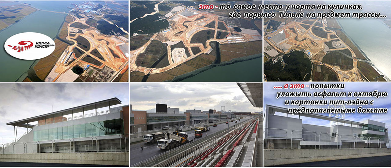 Korean International Circuit, па-русске просто КЫШ - Корейско Ынтернацынальне Шоссе- чорная дыра сезона, поскольку, даже за 1,5 недели до начала на нем одноименнава гран-при, было нихуйа неизвестно, а состоитсо ли сам стардъ!? Не знаю, скока кому подогнали, занесли и откатиле любители фаршырованных цобачег, тока Гномокарлек стоял за этап до последнего, прям каг ученик родоначальнека молдавского самбо Доги. Беспесды, занесли поболе, чем в извеснам чимадане Корейко! Да и бедный Чарли, Чарли (Уайтинг) - смешной чудак, не промолвив даже слова... всьо омологировал. Хотя асфальт для покрытия ещё в читверг видел только в бункерах, а бордюры-отбойнике маршалы будут приклеивать в просветах между шуршащиме первую практику болидаме, причом приклеивать тожы с просветаме. Такова очевидно свежая трактовка безопасности в конторе лягушки-царевичо? При этом тамошние эФИАгеи предполагали опробовать трэк минимум 3 октября на Формуле БМВ, угадилезь канешна…