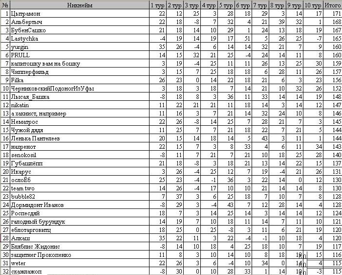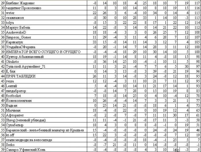 Привецтвую фсех участнеков прогнозтурне на Удаве. Всех с Днем кадровика, пограничнека и химека. Аффтор немного подзаебался с подсчетом второго тура, но вроде все получилось, смотрите внимательно, атинасатый тур разбит на 2 дня, но с перерывом из-за Лиги чемпионов. Не проебите.
