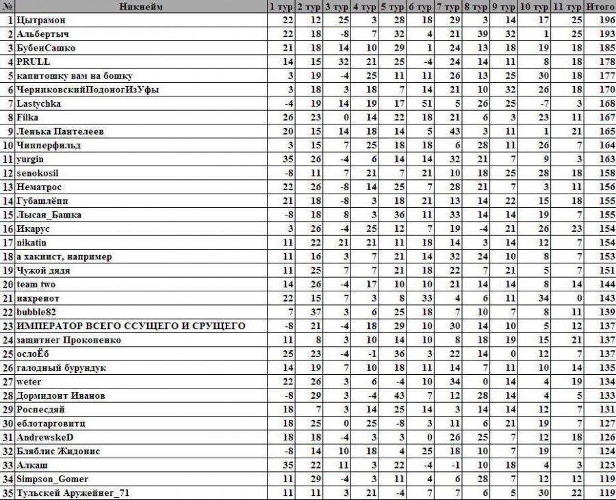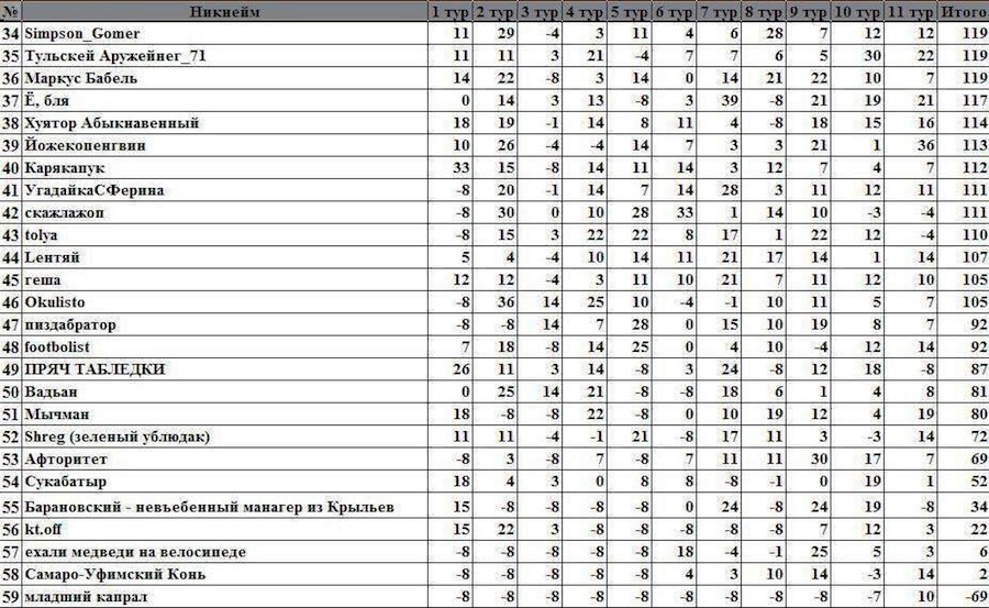 Ну и напаследок: итоговое табличко результатов прогнозов после 11 (пачти, суко) туров.