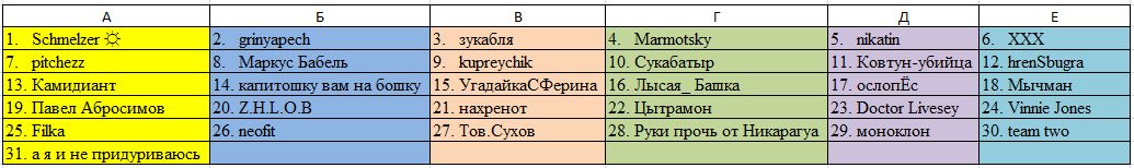 Отступление затянулось, переходим к сути. Учитывая, что первый тур был проебан всеми, кроме Сукабатора (тот, как боеголовка, всегда точен и скурпулезен) сделаем следующим образом. Первый тур объявим сортировочным. Для разбивки камрадов по дивизионам. Дивизионов будет шесть, что бы смогли сыграть все друг с другом за пять оставшихся туров. Очки начисляются, как и везде. 3, 1, 0. В зачет станем брать не двух, как ранее, а трех, что бы не было соплей о несправедливости зачетов исходя из количества участников. Поскольку даже по самым скромным прикидкам число в каждом дивизионе будет от пяти-шести. Разбивка по командам ниже. Извольте взглянуть на табличку. Названия, каторые вы придумаете отсылайте Смотрящему, пусть обзовет вас. Для начала гляньте на итоговую табличку, в который вы ранжырованы согласно набранных очков в Туре 1. Панятно, что многие ждали отдельного крео и не дождались, поэтому и проебали всё, как Гагарин. Будут появляться с заявками на участие, Сукабатор их по порядку добавит в дивизионы, пока условно обозванные по алфавиту