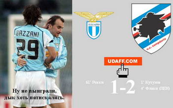 Лацио уступило набравшей приличный ход Сампдории, которая уже вплотную подобралась к зоне Лиги Чемпионов. В последнее время раззабивался беларуский нападающий Виталий Кутузов, захуяривший один решающий мяч в кубке Италии и три банки в чемпионате Италии. И, с учотам травмы Симеоне Индзаги, даже ставший выходить со старта ( чем несказанно удивил Гавноголову ). Забил Кутузов и небесно-голубым, причом уже на первой минуте. А через три минуты Флаки, с пенальти за снос Флаки, удваивает преимущество. Ошарашенное таким началом Лацио так в итоге и не смогло вырвать победу в этом матче. Стоит отметить блестящую игру Перуцци и не забитый пенальти Ди Канио.