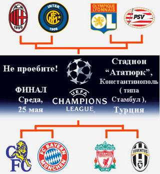 Хуйня какая-то получается -- хде Риал????!!! хде МЮ????!!! одни хуеплётовские команды ....особенна Щелки абрамовича!!!