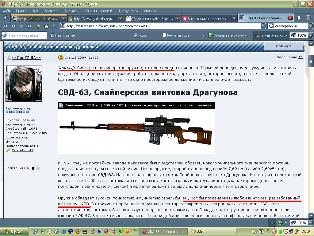 Однако Великий Гуру, выплеснув на ахуевших донецких запас своих энциклопедических занний в области АК и М-16, на этом не остановился нихуя. Мудрость его безгранична, в силу чего требует общественного признания, и ниипет! И Онтошо взялся за снайперскую винтовку Драгунова (СВД) …