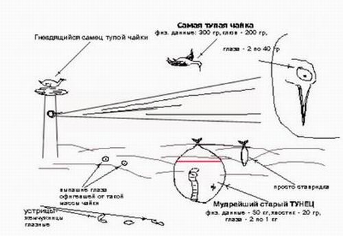 Чайка заходит на маневр (взлетает на метр повыше, опускает клюв вниз, поднимает жопу вверх). Концентрирует зрение на хвостике (интересует перешеек между аналом и ластой, которой заканчивается хвостик). Следует пике, (ветер в жопе, счастливое ебло). Успешный захват хвостика ставридки. С абсолютно счастливым еблом чайка начинает извлекать ставридку из среды обитания. Работа пресса и крыльев приводит к приподниманию тунца (догадались, друзья) над водой до ватерлинии, изображенной красным цветом. Тут чайка осознает, что подъебалась она основательно и, охуев от массы ставридки, лишается глаз, которые никак не хотят смотреть на остальную часть улова. Итак глаза выкатываются из орбит и падают в море. Чайка, уже без ее гордости - глаз, в попытке спасти оставшуюся часть тельца пытается отдать швартовые. Но хуй там. Дело в том, что тунец мудр по всей длине своего круглого тела. Дабы законная добыча не съебалась с праздничного стола, тунец в свободное от чтения книг время активно выделяет через анал клей (в народе именуемый суперклеем) и смазывает им свою гордость - хвостик. В результате клюв чайки намертво входит в контакт с хвостиком мудрейшего. Прочувствовав жопой клиента, тунец грациозно погружается на полжопы под воду, что приводит тупую чайку к полному и окончательному пиздецу. Таким образом в этот день мудрый тунец отведал 20 грамм мясца (клюв не интересует).