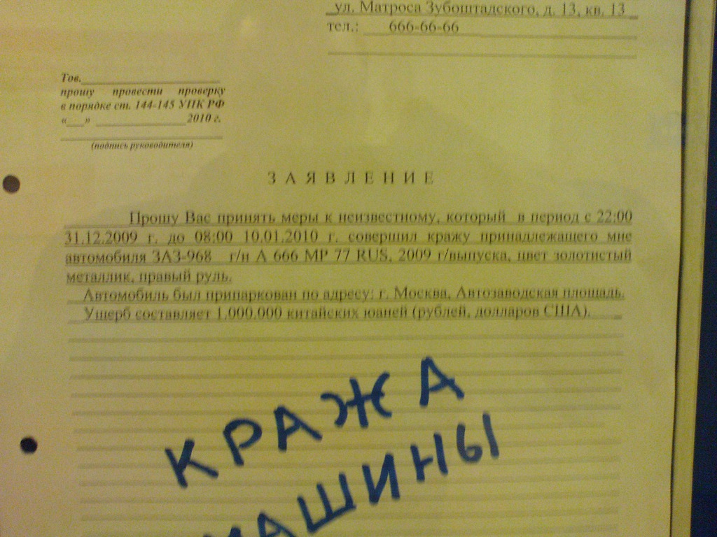в смысле также прошу принять меры ... к неизвестному гражданину... рост 160-199 77 rus... руль правый... совершивший в отношении меня 31.12.2009, а также во все предшевствовашие и последующие годы ряд противоправных действий.... пиздил в децтве... работы нормальной не дал... без машины оставил, на наркотики подсадил, привил плоскостопие и выключил из пенсионного фонда сука!!!