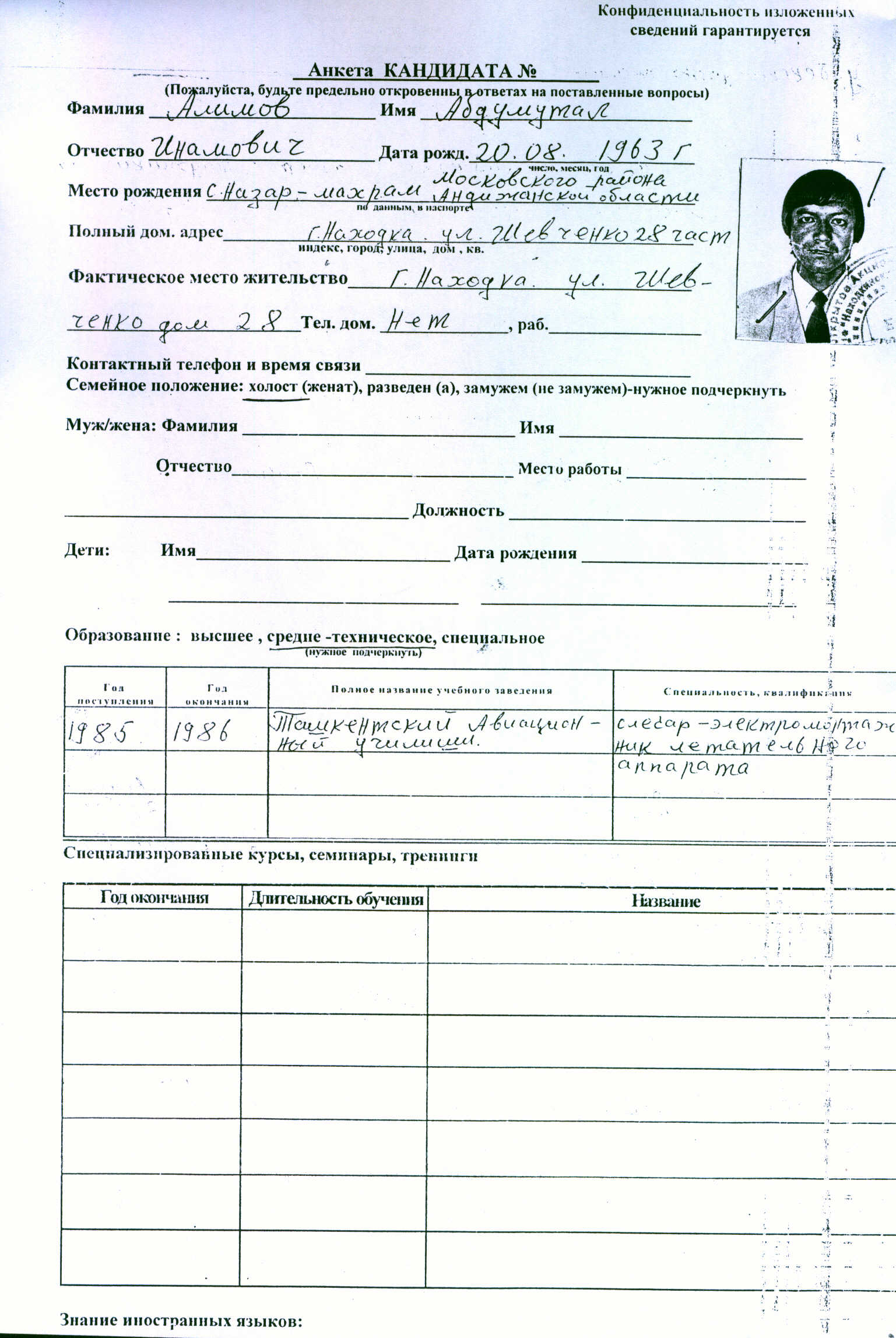 Он на фортепьяно научился играть в процессе погрузки или прыгал с парашютом вместе с фортепьяно...А анкета жесткая, не в каждом кадровом агентстве и фирме такую заполняют. Бедный чурек. 6* и неепет.
