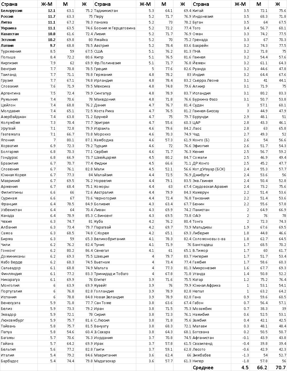 Средняя продолжительность жизни - это наиболее объективный, универсальный, неполитический показатель качества жизни в стране. Я, ващета, всякий раз изучаю ежегодник «Экономизда» внимательно. Именно он ясно показывает, что, вопреки мнению Юры Нестеренко, Россия это не ужос-ужос-ужос, а вполне себе средняя страна верхней части третьего или нижней части второго (смотря как смотреть на полупустой стакан) мира. Она на первом месте по территории, а также производству никеля и палладия. По остальным параметрам она первых мест не занимает и не находится ни в самом верху, ни в самом низу никаких значимых списков. Это отностся и к продолжительности жизни - на первый взгляд. На второй взгляд мы обнаруживаем существенные нюансы.