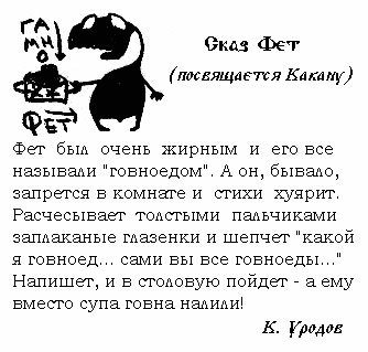 *** К.У. Паразительная конвергенция несколько лет назад я написал рассказик про своего Трофима, в котором "его все называли "говноедом". Рассказ я проебал и никуда не постил. А как твою сказочку прочел так сразу озарение: епт, так ведь Трофим был Фетовской реинкарнацией. Имена разные, род занятий разный, в сущность одна - оба гавноеды. Какой тут абсурд, господа падонки, все очень конструктино.