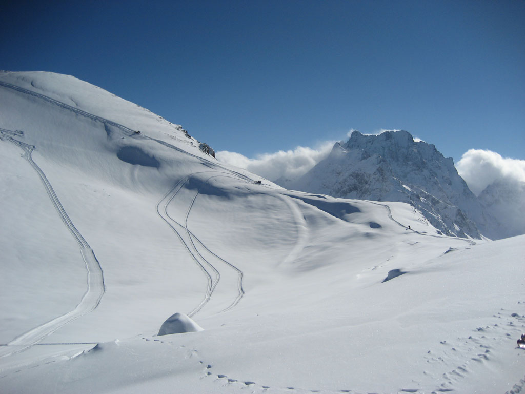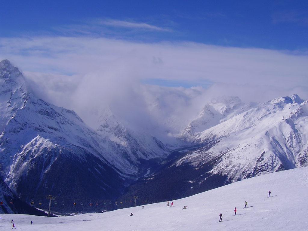 вообще из разговоров с туристами и своих ощущений я понял что на Домбай все едут ради внетрассового катания. Огороженных трасс там как таковых нет (какие то спуски сильнее укатаны просто)ратраки ездят редко, есть гора и куча подъемников, после снегопада пухляк укатывают дня 3 как мне показалось и все равно остается дохуя целины (в поляне не был и наврядли поеду)