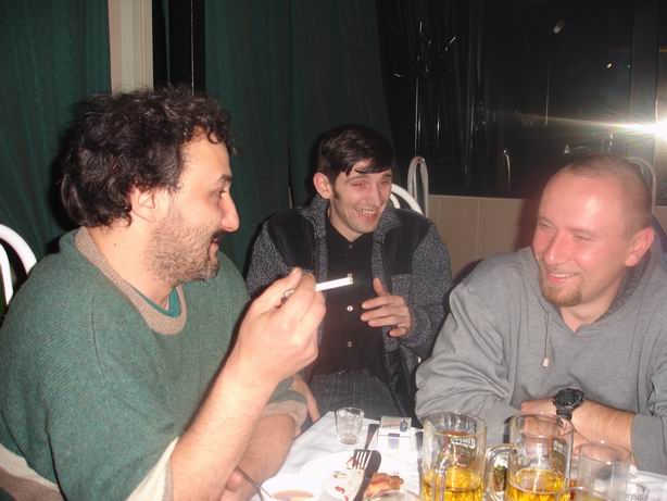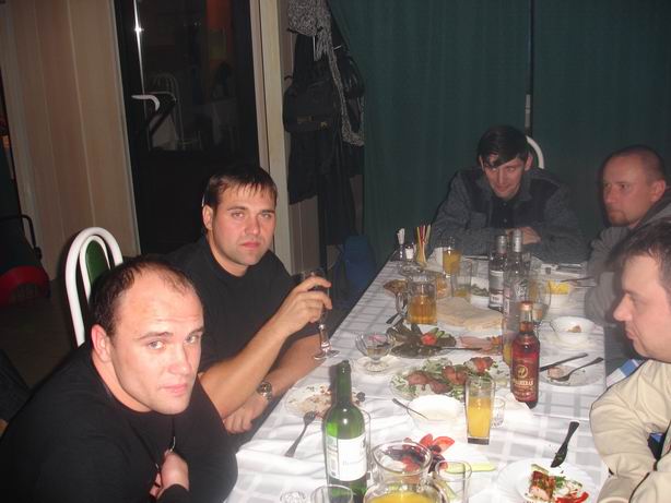 Сначало была пианка в Маскве….. Организовали бухалово коллеги "sqwer" и "мясо". Остальных вы лехко узнаете на фотках. Помню што кабак был какойта чурбанский ("Али-Баба", штоли?) и весь вечер на сцену порывался петь сваи пестни какойта уебок-армянин. Потом народ постановил давать ему денег за каждый час тишины. Короче тишина в зале оплачивалась нами примерно 5 часов. Стоило это не дорого. 500 рублей час. Потом нас все заебало и пьяные и довольные мы разбрелись кто куда.