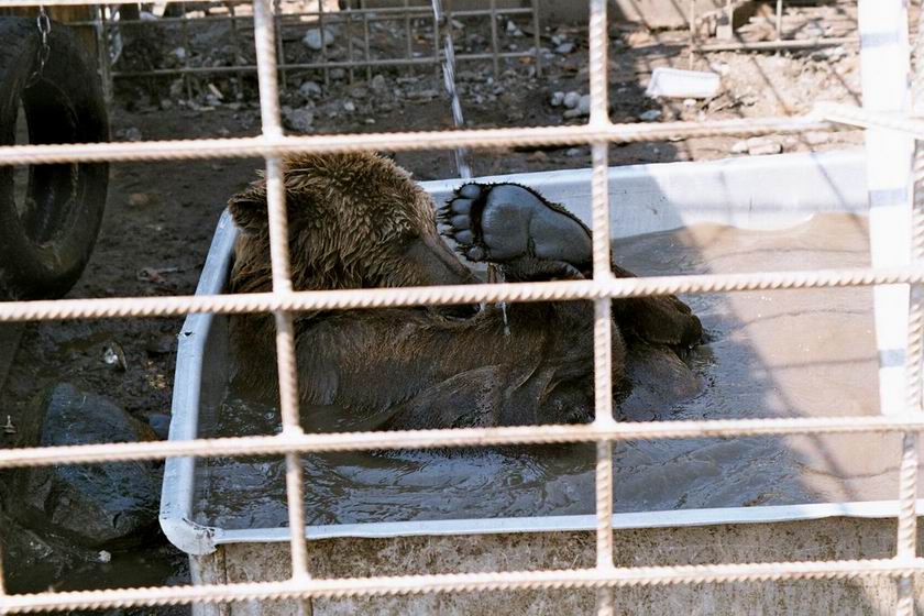 На фоне дикой природы медвежонок маленький в клетке. Душно.