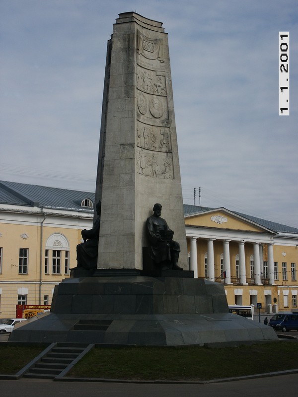 патамушто вокруг этой "стеллы" сидят трое мушчин, типа из разных эпох (русский витязь, ремесленник, и советский рабочий с трахтором)
