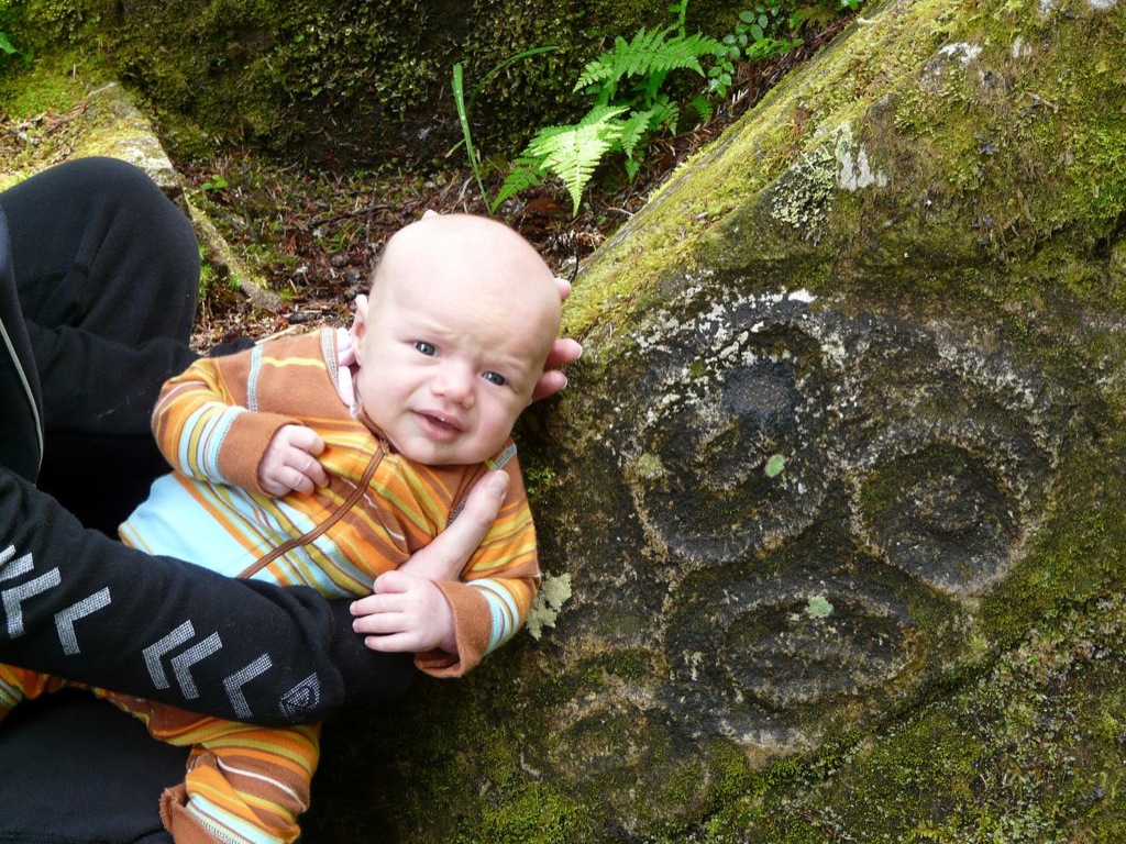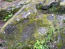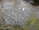 Я скажу, в малопосещаемых и малообитаемых местах иногда сохраняется то, что в более цивильных местах поизгажено и подреставрировано. Вот поглядите на (25-27) - этим наскальным выцарапываниям не меньше двух с половиной тыщ лет, и они сохранились посреди леса в натуральном виде. Случайный человек их не найдет, и местные не очень любят, когда туда ходят, но, как было сказано выше, в тех краях трудно что-то запретить. Памятник реальный, он описан в исторической литературе. Представляете, до рождения Христа - и на том же месте осталось, никем не тронутое. Странное ощущение. Смотрели мы на эти царапки, смотрели, думали, что они напоминают. И доперли (27). Портретное сходство, да.