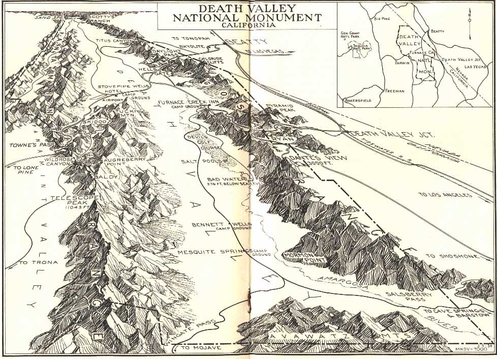 Сейчас популярны стали книжки типа «100000 мест, которые надо посетить, пока не загнешься». Ога. Но у меня краткий списочек, кажется, был всегда, и я помаленьку-потихоньку его осваиваю. Долина Смерти (ДС) в нем давно красовалась в самом верху. Во-первых, одно из любимых кин моего децтва - «Забриски Пойнт» Антониони, где активно ибуццо в дюнах и рисуют на стыренном ероплане огромный хуй, впоследствии демонстрируемый народу с воздуха (эта…для тех, у кого английский не родной…так итальянец наглядно постебалсо над народным выражением «flying fuck»). Снимал он конкретно в Забриски Пойнт, а не в студии. Во-вторых, в неизреченной мудрости своей, Чарльз Мэнсон туда вывез свою банду укурков после серии убийств (дело Тейт-ЛаБьянка) прятаццо, на старом школьном автобусе, именно туда, где шины рвутся на неасфальтированной дороге за час. Они, правда, полагали, что где-то там затаилась Бесконечная Дыра, и долго ее искали. Но не нашли. Не успели. Их в ДС и забрали. Да, и в третьих, на старых картах (фото 1) ДС  необычайно напоминает песду, что почетно само по себе.
