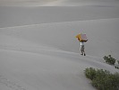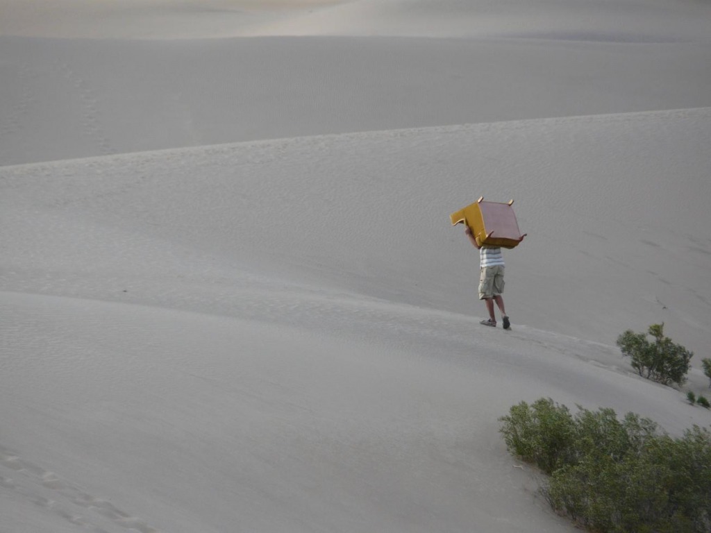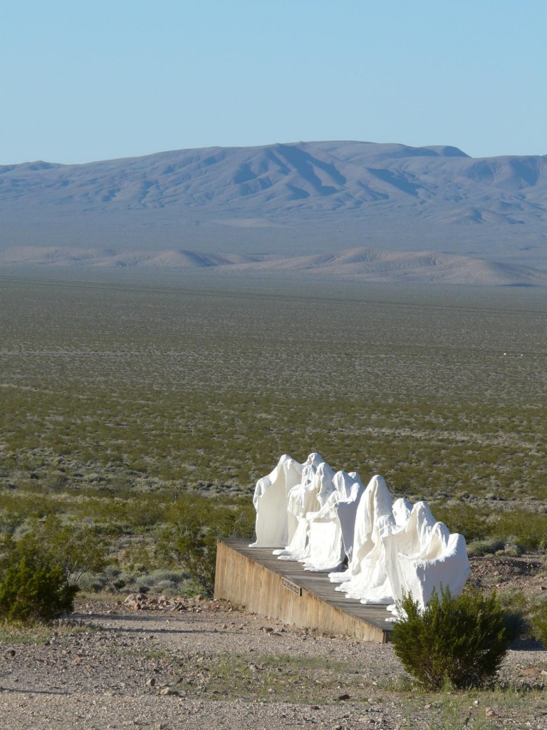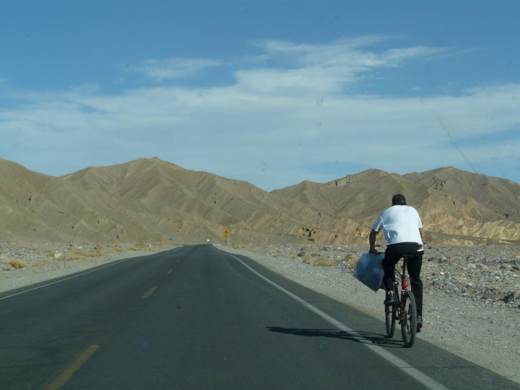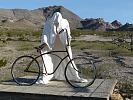 Может, на этом и закончим пока. В общем, ДС такое место, где каждый находит для себя то, что ищет. Хочешь сблизиться с природой (в хорошем смысле) забесплатно - да сколько хошь (76). Хочешь с понтом за 450 долларов/ночь - твое право (77, 78). Хочешь повыть на луну в одиночестве - все возможности, луна в твоем распоряжении (79; кстати звездное небо там исключительное - ничего же не отсвечивает - а Б.Медведица располагается в небе вверх ногами). Есть любители кататься на велосипеде по почти сорокаградусной жаре (80). Есть любители пофоткать природу (см. выше), а некоторым интереснее всего снять свой автопердильник на экзотическом фоне (81). Можно вообще провести все время у игровых автоматов (как мы уже говорили, в Неваде порок поощряется; на фото 82 - машины для последнего, прощального вброса денег - прямо в аэропорту). Можно даже заняться убогой политической жизнью пустыни (83; западло переводить и тем более объяснять). Было б только время. Но реальная жизнь зовет протяжным, отвратительным зовом, и дорога в этот фантастический мир неизбежно раскручивается взад (84). Может, потом что-нибудь приснится. Типа, из работ выдающегося  бельгийского скульптора Альберта Шукальского (85).