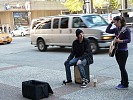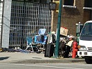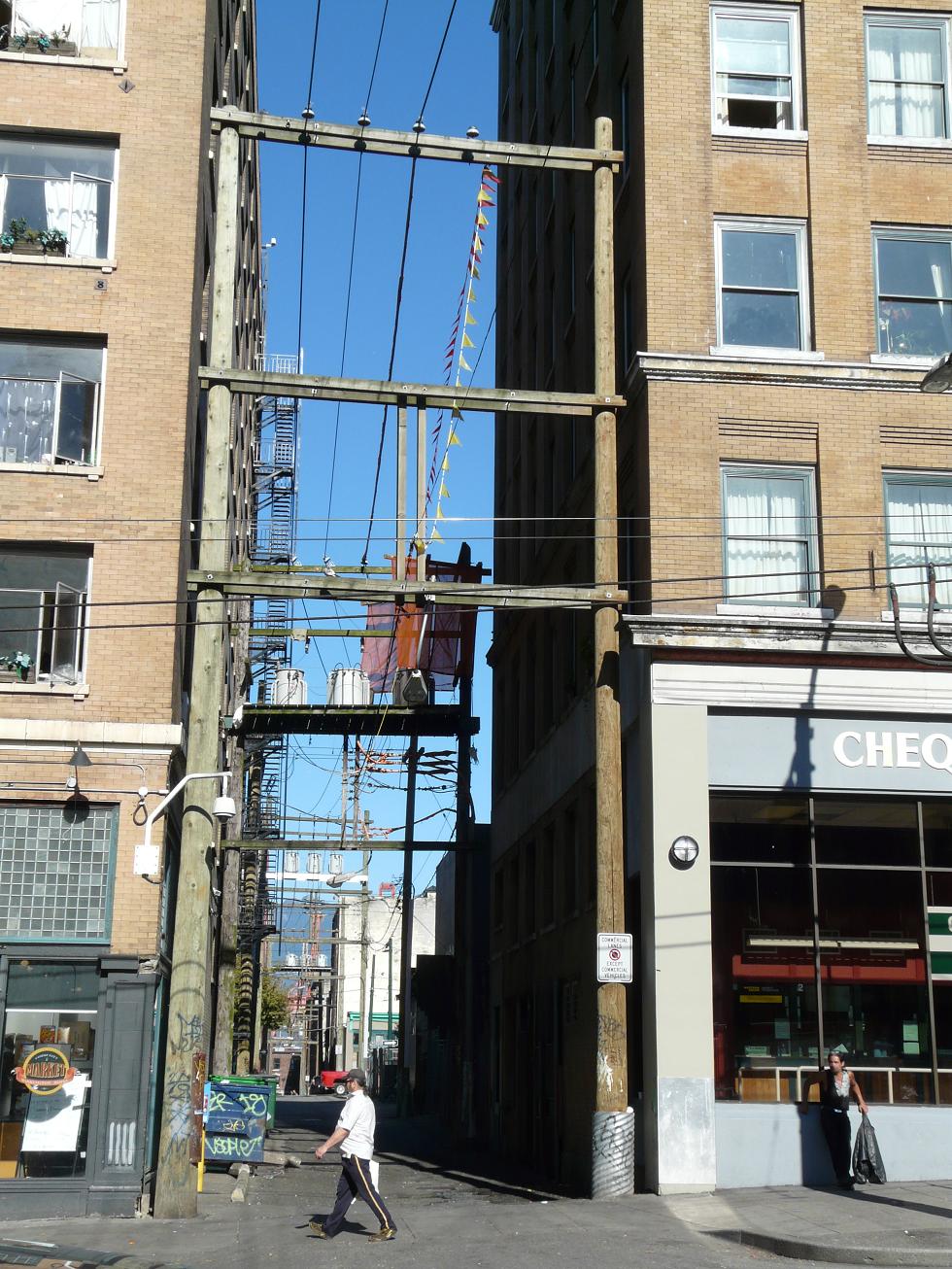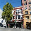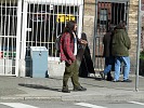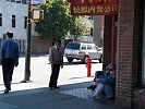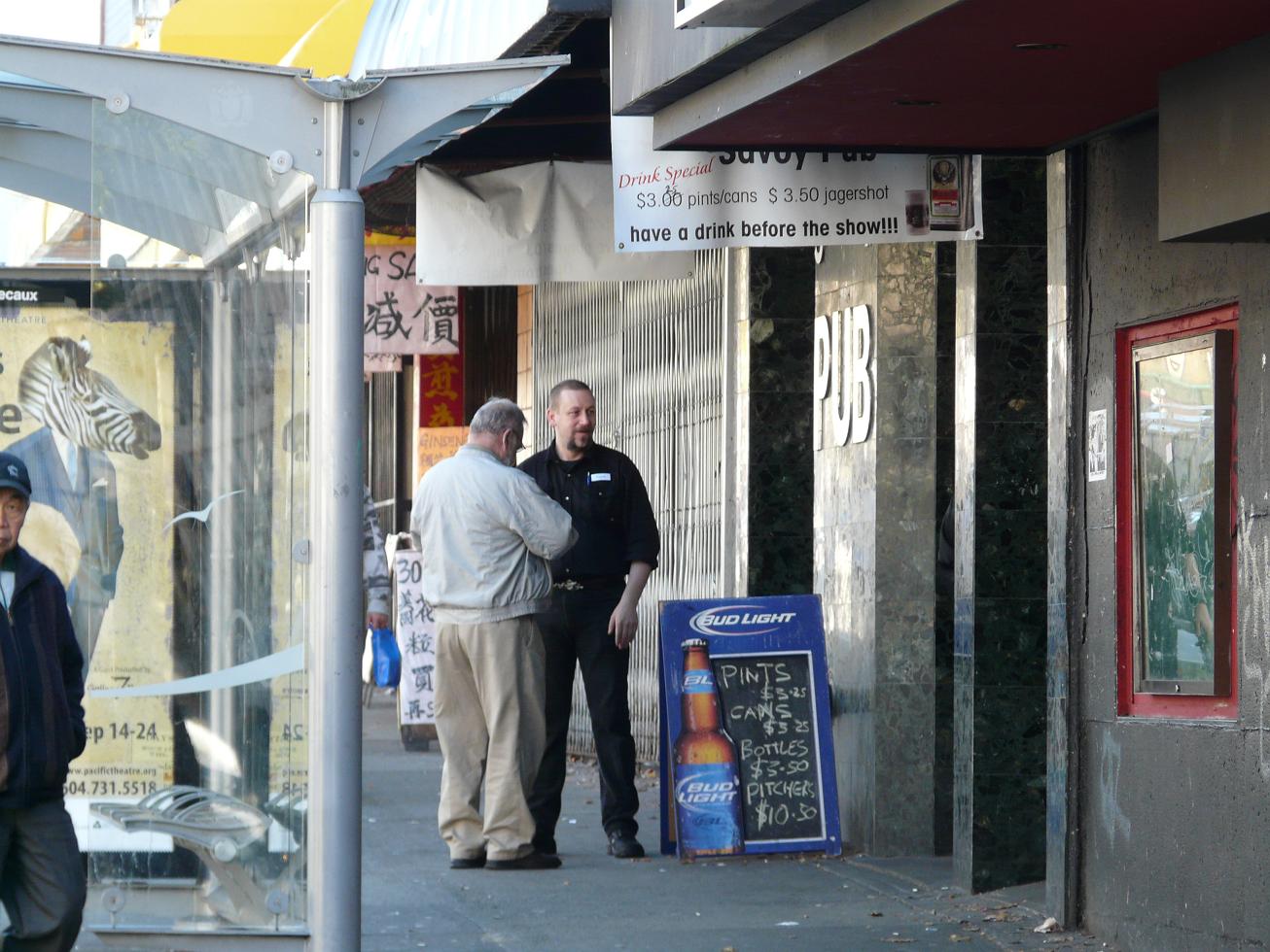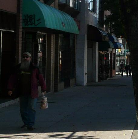 А вот и бомжи. Этот (32) живет прямо на углу проезжей улицы, у гидранта. Наши бомжи,кстате, культурные, не чуждые политической жизни: вон, газетку читает (33). Ему сильно поможет. На (34) – одна пока не названная особенность района. Он пересекается с историческим Китай-городом («новые китайцы» живут в Ричмонде, это не связано с нaшим предметом), и видеть рядом грязных бомжей и смотрящих на них как солдат на вошь вполне цивильных китайцев – обычное дело. Китайцы местных не боятся, агрессивности у контингента мало, разве своруют что. Да и привыкли китайцы, как и город в целом. Разве что жывотные еще удивляются (35). А так – бляди как бляди, торчки как торчки (36-46). Там и типа цивильные развлечения есть, с вменяемым персоналом и дешевой выпивкой: вон, настоятельно предлагают поддать перед представлением (37). Вот за вменяемость клиентуры я бы, однако, не поручился. Скорее, поручился бы за другое. Я не скажу точно насчет именно здания (38), внутри пока не был, но по виду – одно из мест, где снимают комнаты задешево для того, чтобы лежать там на матрацах на полу вдесятером поколотыми. Тем же целям служат и типагостиницы, которых тоже есть на Хастингсе. А чо, живут люди, вон, даже белье иногда стирают и сушат (39).