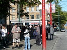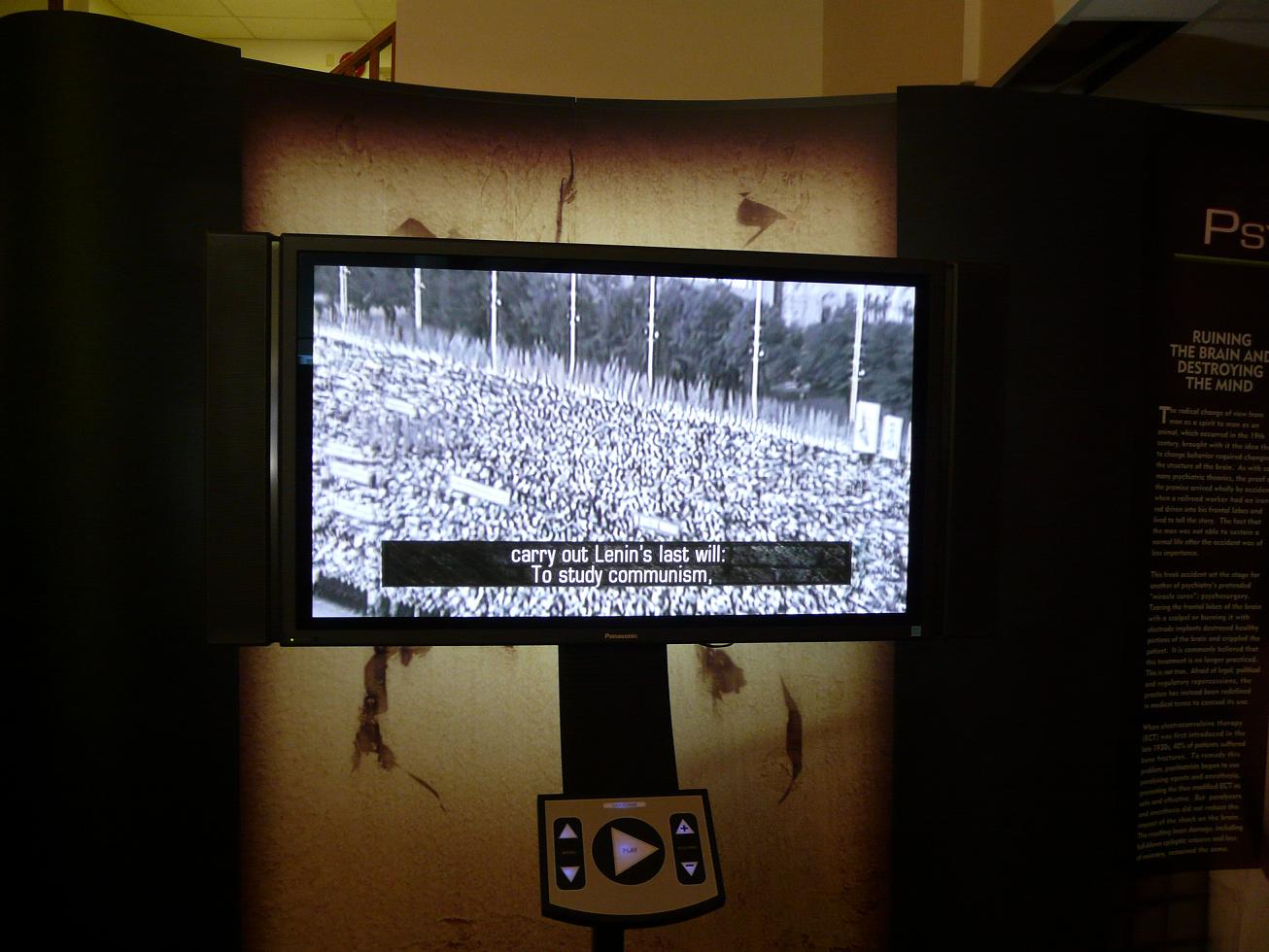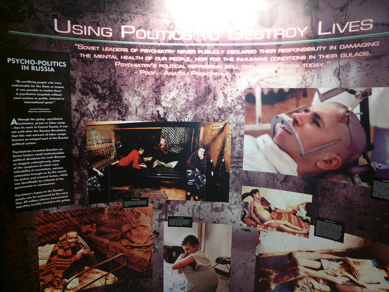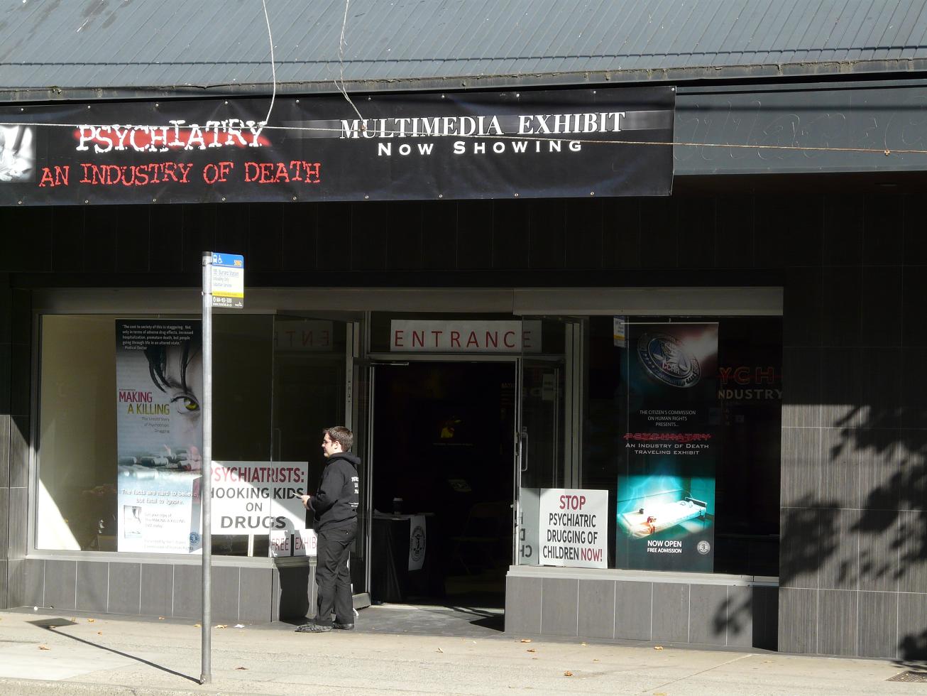 Между тем, на безопасном расстоянии от всего этого содома-и-геморроя правозащитники (47) продолжали свою благородную деятельность. Поскольку в отдельно взятой области победа уже была одержана (см. выше), сейчас они, успешно пошакалив у Церкви Сайентологии, обратились к непосредственной борьбе с главным врагом народа, показанного в моем материале – с врачами-психиатрами. Картинки (48-51) дают представление о выставке «Психиатрия – индустрия смерти», открытой на Вест-Хастингс, в минутах пятнадцати ходьбы от Карнеги-центра. И таки да, почетное место там занимает советская карательная психиатрия, через узилища которой, как вы можете убедиться из текста на постере (49) прошло 40 мильенов человек. Почему-то, впрочем, кино на ту же тему (50) упоминает более скромную цифру, всего лишь 1-2 миллиона. Я, конечно, не упустил возможность поговорить с пацаном-куратором выставки (48 – да, именно этот мудаг). На мой осторожный вопрос, уверены ли организаторы, что именно мильен диссидентов был посажен совецкой властью в психушки, я получил возмущенный длинный монолог на тему – как можно сомневаться, если это результат исследований уважаемой киностудии в Лос-Анджелесе, да еще и сами диссиденты подтверждают. Вот, например, знаменитый диссидент Михаил Кукобака (51). Не, ну если сам Кукобака, то не с чем спорить, да. Я только пожелал всяческих успехов в актуальной борьбе с карательной психиатрией. Очередная победа тут, несомненно, еще раз поможет всему.