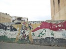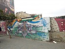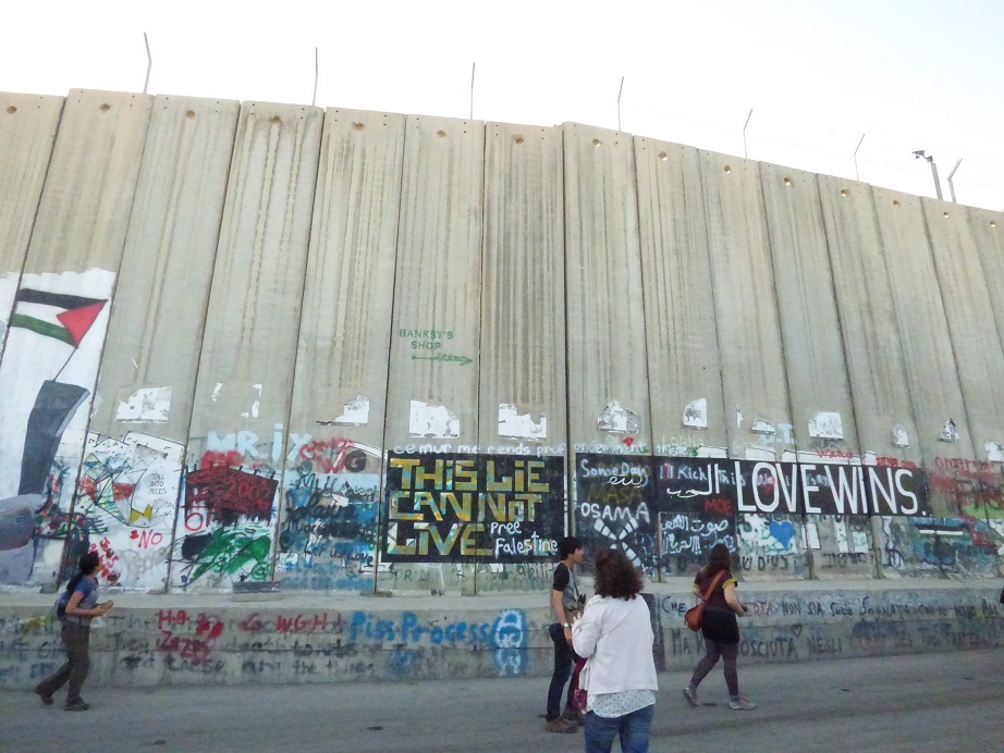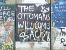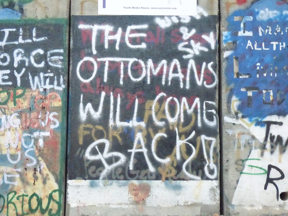 Борьба за независимость Палестины средствами изобразительного искусства давно, как вы уже, думаю, поняли, превратилась в коммерческий аттракцион. Туристов возят специально к Разделительной стене. Банкси, с его развитым нюхом на конъюнктуру, конечно, отметился там одним из первых (30). Но в направлении, указанном стрелкой, уже ничего нет. Потому что отметился он не на контролируемой израильской военщиной стене, а на автономной арапской стене рядом. Как вы понимаете, все умные, а некоторые умнее других. За сто кусков зеленых арапцы разрешили богатому туристу выпилить один кусок стенки и увезти его к себе домой. А хуле, если карта идет? Впрочем, самая знаменитая роспись Банкси пока на месте; я, конечно, тоже хотел увезти, но деньжат малехо не хватило, и я только временно дополнил композицию (31). Кстати, вам никто не говорил, каковы конкретно чаяния, отражаемые в настенной графике? Чего хочут-то? Вот я вам щас покажу. «Оттоманская империя вернеццо!» (32). Ога, размечтались. Босанская солидарность (33) – да, это очень уместно, именно здесь только второй Боснии и не хватало. На фоне босанского флага размноженная в типографии мечта местного пацана съэбать отсюда нах выглядит как нельзя более уместной.