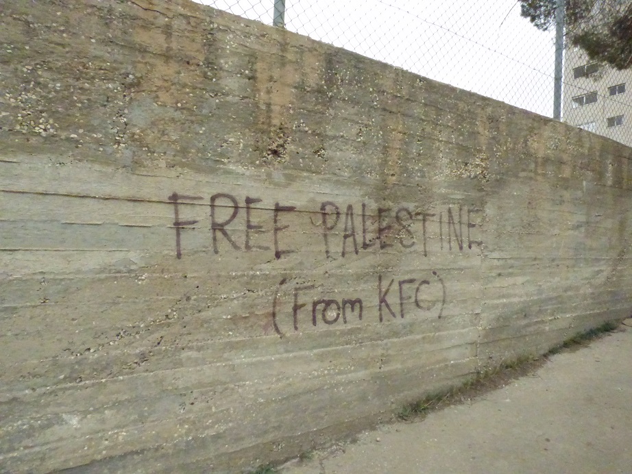 Ващета, в столце Палестинской автономии имеется целых две главных площади - №1 (вы видели) и № 2 (Мугтарбин); на последней (22, 23) исторических событий не происходило, она примечательна только памятником «Жыды пытаюццо спиздить независимость Палестины» (24), неизвестного скульптора (возможно, Церетели). Тема жыдофского угнетения обильно представлена, за неимением в Зоне А жыдофф жывьем, в назаборной графике. Не обрубить им корень, хотя и пытаюццо (25) и не остановить педофила, умыкающего мусульманского младенца (я так понял, 26). Лучший лозунг, попавшийся мне на глаза вблизи пл. №1, впрочем, вот этот (27), я его теперь всем цитирую. На случай, если кто с Бабруйска, KFC = Kentucky Fried Chicken, фастфуд типо. Кстати, справедливости ради отмечу неактуальность лозунга – народ там в массе не жирный, хотя и вполне себе упитанный (не, они конечно, страдают, да, но по большей части морально – 28, 29).